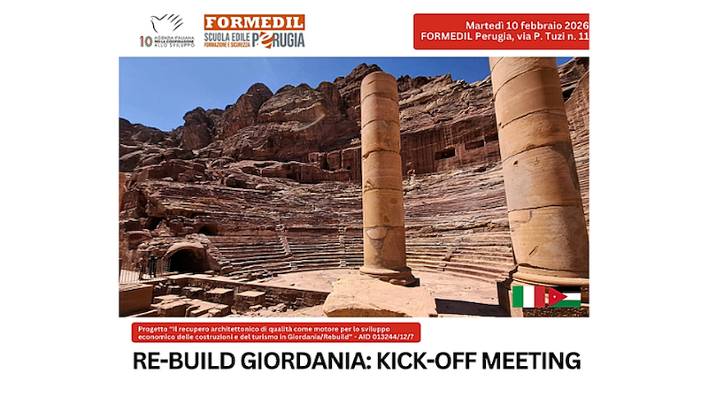 Domani alle ore 10 nella sede di Formedil Perugia, si terrà il kick-off meeting ufficiale che vedrà la presentazione dell'iniziativa ideata da Formedil Perugia e KIMIA e di tutti i partner italiani e giordani coinvolti nella valorizzazione e salvaguardia di siti di valore universale come Petra, patrimonio UNESCO, e più in generale al rafforzamento del settore edilizio giordano.