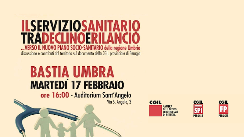 Una serie di appuntamenti utili a promuovere un reale ascolto delle esigenze dei cittadini e del territorio e affrontare insieme i nodi presentati dalla stessa Cgil di Perugia nel documento "Il servizio sanitario tra declino e rilancio" elaborato insieme a operatori e tecnici del sistema sanitario regionale e con la collaborazione dello Spi Cgil di Perugia, della Funzione Pubblica Cgil di Perugia e dell'Associazione Nuove Ri-Generazioni Umbria.